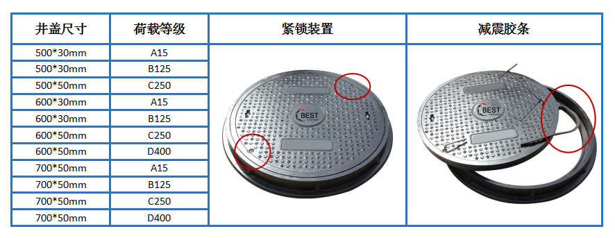 井蓋一種常見的道路覆蓋設備,什么等級的井蓋安裝在什么位置這都是有嚴格要求的。例如綠化帶區域用A15等級;人行道、非機動車道等區域用B125等級;居民小區、寫字樓、醫院等區域用C250等級;主干道、高速路、公路等區域用D400等級;加油站、貨運站等區域用E600等級;機場跑道、碼頭等區域用F900等級。