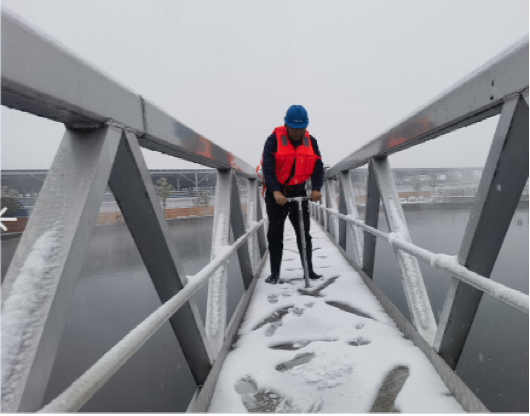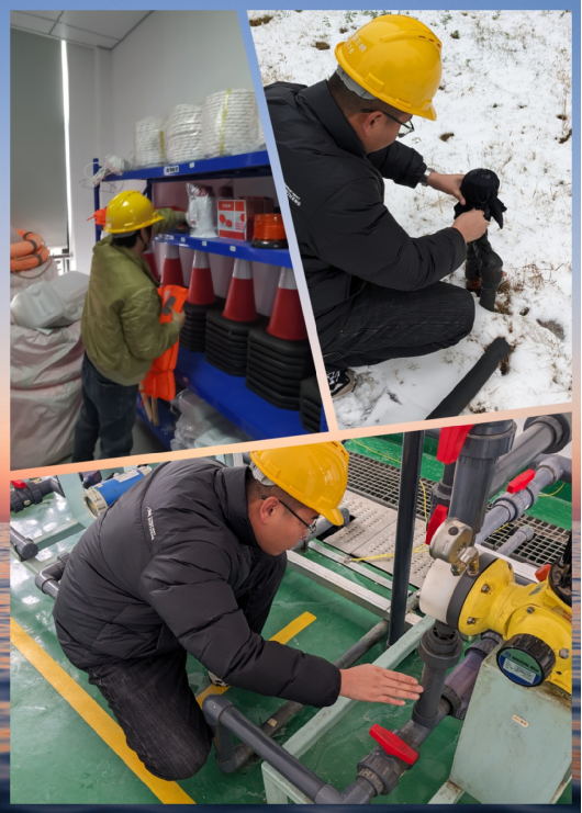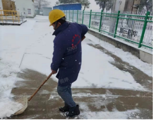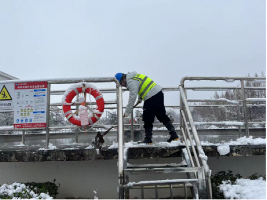 以“雪”為令,行動(dòng)在前。建立應(yīng)急保障三級(jí)梯隊(duì),各生產(chǎn)廠區(qū)“以‘雪’為令”,堅(jiān)持“即下即清”的原則,及時(shí)清理巡視路線、辦公區(qū)域、平流池積雪并鋪設(shè)防滑墊,放置融雪劑、除冰鏟,切實(shí)保障職工人身安全。污水處理廠的管道系統(tǒng)在低溫下容易結(jié)冰,為防止設(shè)備在低溫下出現(xiàn)故障,對(duì)所有污水處理設(shè)備進(jìn)行保溫處理,用保溫材料包裹水泵、電機(jī)等關(guān)鍵設(shè)備,以減少熱量散失。