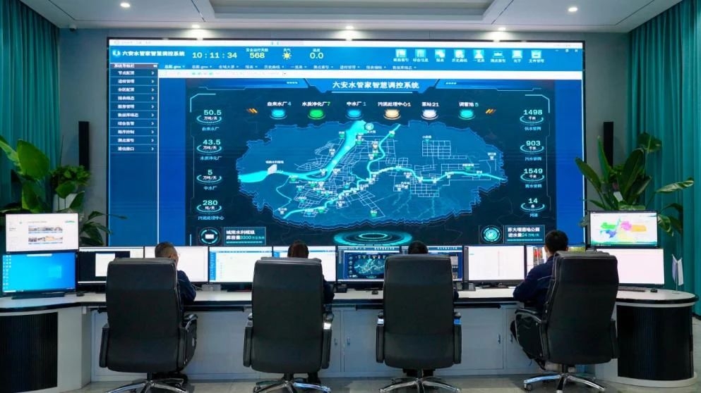 三峽集團安徽六安水管家智慧調(diào)控中心,運維人員鼠標(biāo)輕點,一張數(shù)字大屏映入眼簾,城區(qū)27個泵站、8個水質(zhì)凈化廠、4座供水廠、5個調(diào)蓄池、1座中水廠、1座污泥處理中心,以及4000多公里供排水管網(wǎng)的數(shù)據(jù)狀態(tài)清晰可見。